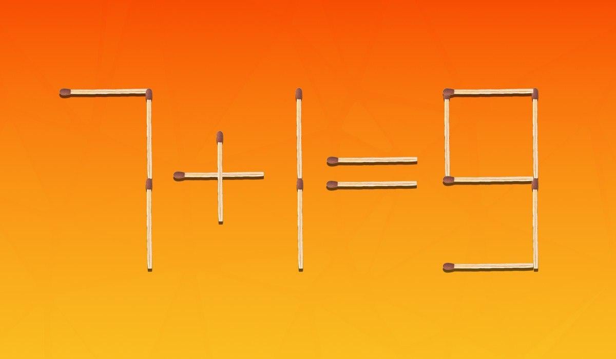 Nižšie uvidíte obrázok, na ktorom je rovnosť 7+1=9 rozložená pomocou zápaliek. Je zrejmé, že je to matematicky nesprávne a musíte to opraviť tak, že presuniete len dve zápalky z 15.