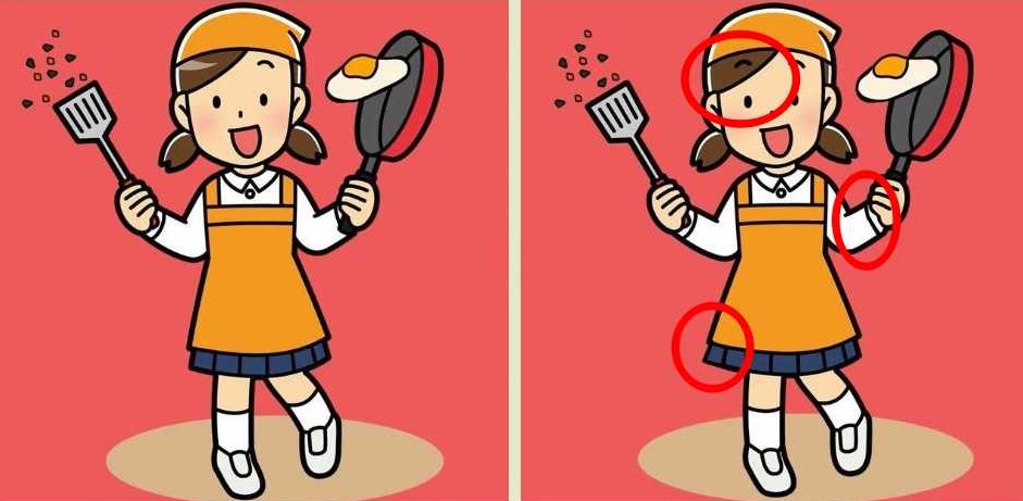 Na oboch kresbách je zobrazené dievča, ktoré pripravuje miešané vajíčka. A zdá sa, že má problém, pretože vyprážané vajíčko sa chystá z panvice spadnúť na zem.