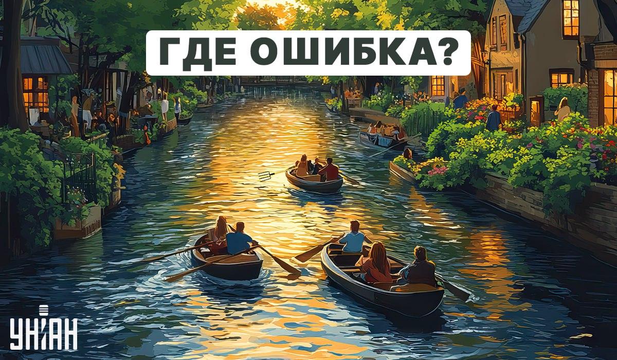 Pred sebou máte obrázok, na ktorom je zobrazená krásna krajina večerného mesta. Medzi domami tečie rieka, po ktorej plávajú ľudia v člnoch. Na prvý pohľad sa obrázok zdá byť normálny, ale v skutočnosti je na ňom hrubá chyba.